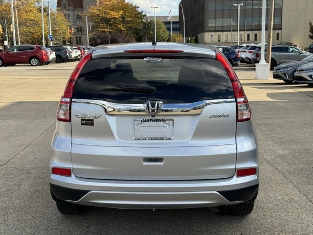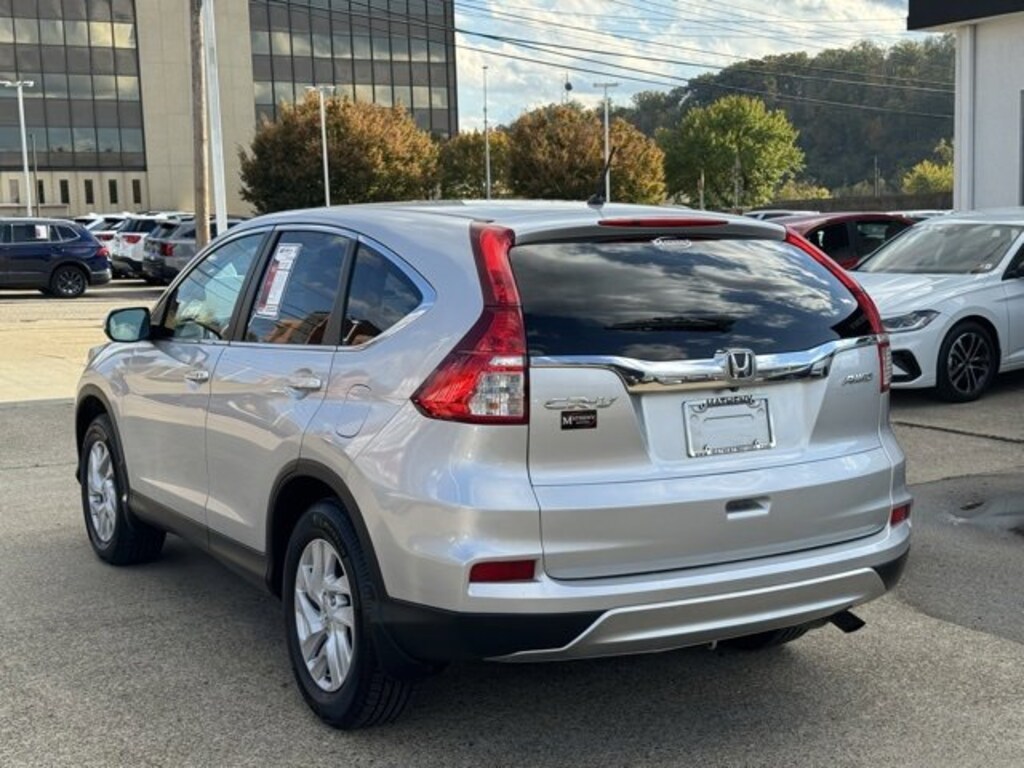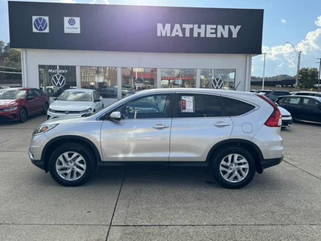The Matheny Family has been in business for over 100 years, buy with confidence!!!!26/33 City/Highway MPG Recent Arrival!17 Alloy Wheels, 4-Wheel Disc Brakes, 5.048 Axle Ratio, 6 Speakers, ABS brakes, Air Conditioning, Alloy wheels, AM/FM radio, AM/FM/CD Audio System w/6 Speakers, Brake assist, Bumpers: body-color, CD player, Cloth Seat Trim, Compass, Delay-off headlights, Driver door bin, Driver vanity mirror, Dual front impact airbags, Dual front side impact airbags, Electronic Stability Control, Exterior Parking Camera Rear, Four wheel independent suspension, Front anti-roll bar, Front Bucket Seats, Front Center Armrest, Front fog lights, Front reading lights, Heated Front Bucket Seats, Heated front seats, Illuminated entry, Low tire pressure warning, Occupant sensing airbag, Outside temperature display, Overhead airbag, Overhead console, Panic alarm, Passenger door bin, Passenger vanity mirror, Power door mirrors, Power driver seat, Power moonroof, Power steering, Power windows, Radio data system, Rear anti-roll bar, Rear seat center armrest, Rear window defroster, Rear window wiper, Remote keyless entry, Security system, Speed control, Speed-sensing steering, Speed-Sensitive Wipers, Split folding rear seat, Steering wheel mounted audio controls, Tachometer, Telescoping steering wheel, Tilt steering wheel, Traction control, Trip computer, Variably intermittent wipers.2015 Honda CR-V EX Silver 4D Sport Utility AWD CVT 2.4L I4 DOHC 16V i-VTECAwards:* Motor Trend Automobiles of the year * ALG Residual Value Awards, Residual Value Awards * 2015 IIHS Top Safety Pick+ (With Touring Model) * 2015 KBB.com Brand Image AwardsKelley Blue Book Brand Image Awards are based on the Brand Watch(tm) study from Kelley Blue Book Market Intelligence. Award calculated among non-luxury shoppers. For more information, visit www.kbb.com. Kelley Blue Book is a registered trademark of Kelley Blue Book Co., Inc.