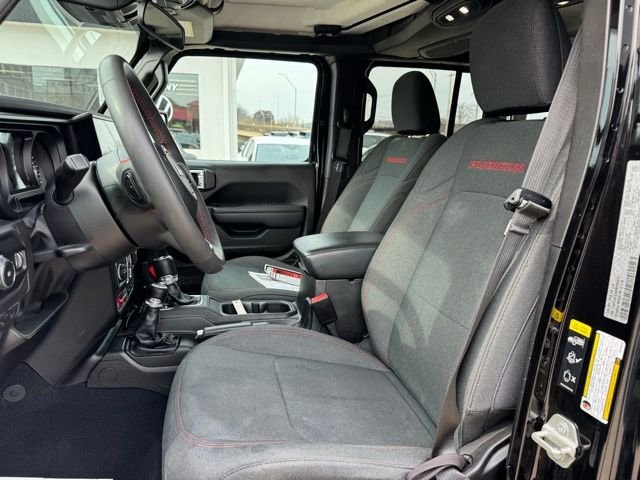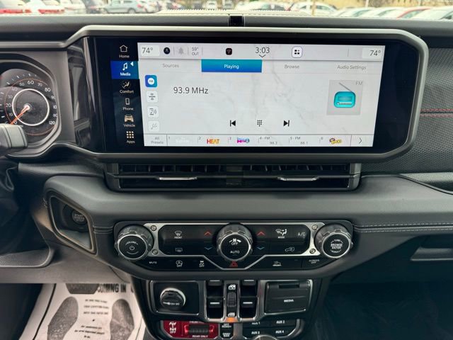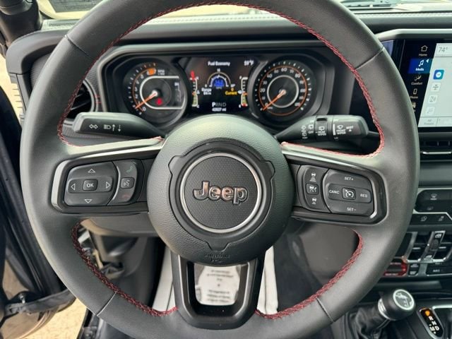 12.3 Touchscreen Display, 4-Wheel Disc Brakes, 4.10 Rear Axle Ratio, 8 Speakers, 97 MPH Vehicle Max Speed Calibration, ABS brakes, Air Conditioning, Alloy wheels, AM/FM radio: SiriusXM, Apple CarPlay, Apple CarPlay/Android Auto, Automatic temperature control, Aux Battery, Black 3-Piece Hard Top, Brake assist, Cloth Low-Back Bucket Seats, Compass, Connectivity - US/Canada, Delay-off headlights, Disassociated Touchscreen Display, Driver door bin, Driver vanity mirror, Dual front impact airbags, Dual front side impact airbags, Electronic Stability Control, Emergency communication system: Jeep Connect, Freedom Panel Storage Bag, Front anti-roll bar, Front Bucket Seats, Front Center Armrest w/Storage, Front dual zone A/C, Front fog lights, Front License Plate Bracket, Front reading lights, Fully automatic headlights, Google Android Auto, Heated door mirrors, Illuminated entry, Integrated Center Stack Radio, Integrated roll-over protection, Integrated Voice Command w/Bluetooth, Low tire pressure warning, No Soft Top, Non-Lock Fuel Cap w/o Discriminator, Occupant sensing airbag, Outside temperature display, Overhead airbag, Panic alarm, ParkView Rear Back-Up Camera, Passenger door bin, Passenger vanity mirror, Performance Suspension, Power door mirrors, Power steering, Power windows, Quick Order Package 24R Rubicon, Radio data system, Radio: Uconnect 5 w/12.3 Display, Rear anti-roll bar, Rear reading lights, Rear Window Defroster, Rear Window Wiper/Washer, Remote keyless entry, Security system, Speed control, Split folding rear seat, Steering wheel mounted audio controls, Stop-Start Dual Battery System, Tachometer, Telescoping steering wheel, Tilt steering wheel, Traction control, Trip computer, Variably intermittent wipers, Voltmeter, Wheels: 17 x 7.5 Machined/Painted Black.